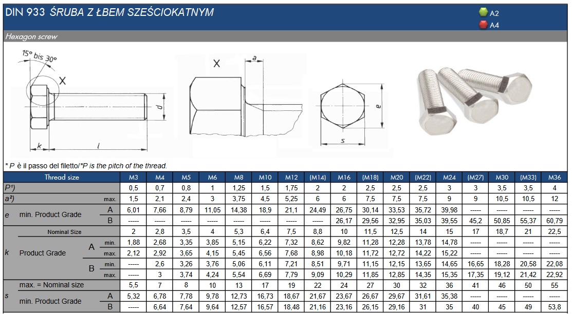 Dzięki wykorzystaniu innowacyjnych technologii do produkcji śrub DIN 933 A2 możemy zaoferować solidne produkty o najwyższej klasie wytrzymałości elementów mechanicznych i właściwościach fizykochemicznych. Śruby DIN 933 A2 ze względu na estetyczny wygląd znalazły zastosowanie w tworzeniu elementów złącznikowych urządzeń dostępnych na placach zabaw, siłowniach, parkach rekreacyjno-rozrywkowych oraz szeroko rozumianym przemyśle i transporcie.